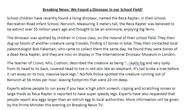 Basing their story around recent dinosaur discovery in drama, they created fake newspaper articles, telling of their discovery. We are looking forward to the Year 1 children reading all about this next year!
