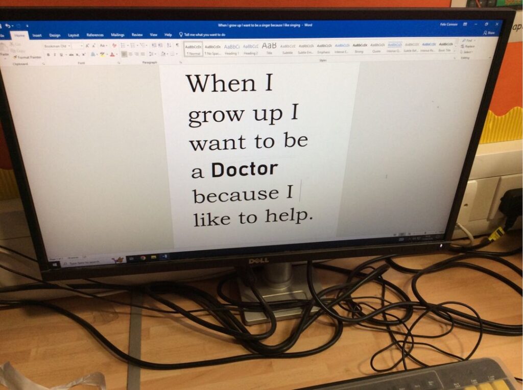 Then we were introduced to MS Word. We typed a sentence about what we wanted to do when we grew up and why. To make the text more interesting we learnt how to select the text to add effects. Everyone found it a bit tricky at first having to drag and select the text (as they were used to just clicking on it with Textease to select it) but after a few goes it got a lot easier. They noted that the bar along the top had effects that they needed to change, like font type, size and colour plus things to enhance it further such as bold, italic and underline.
