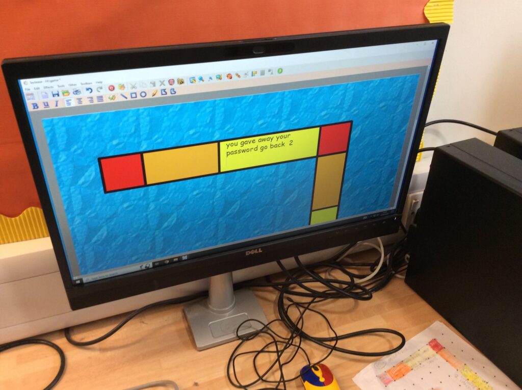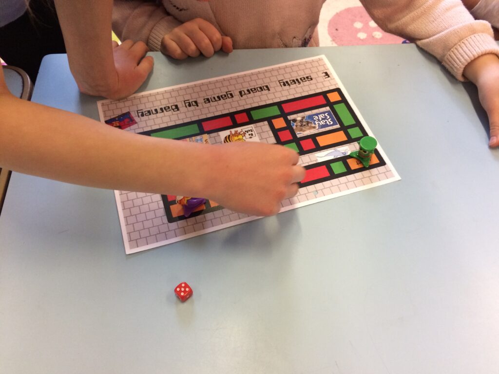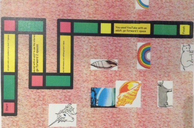 In the first session they designed their board game on paper, mapping out their pathway and selecting which spaces were going to have the ‘good’ and ‘bad’ rule spaces. These were rules about keeping you safe when going using a computer, tablet or phone.